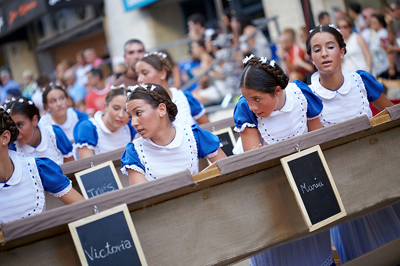 - 15 Bailarinas con vestuarios en azulón y organdy blanco plisado en plataforma con pupitres.
